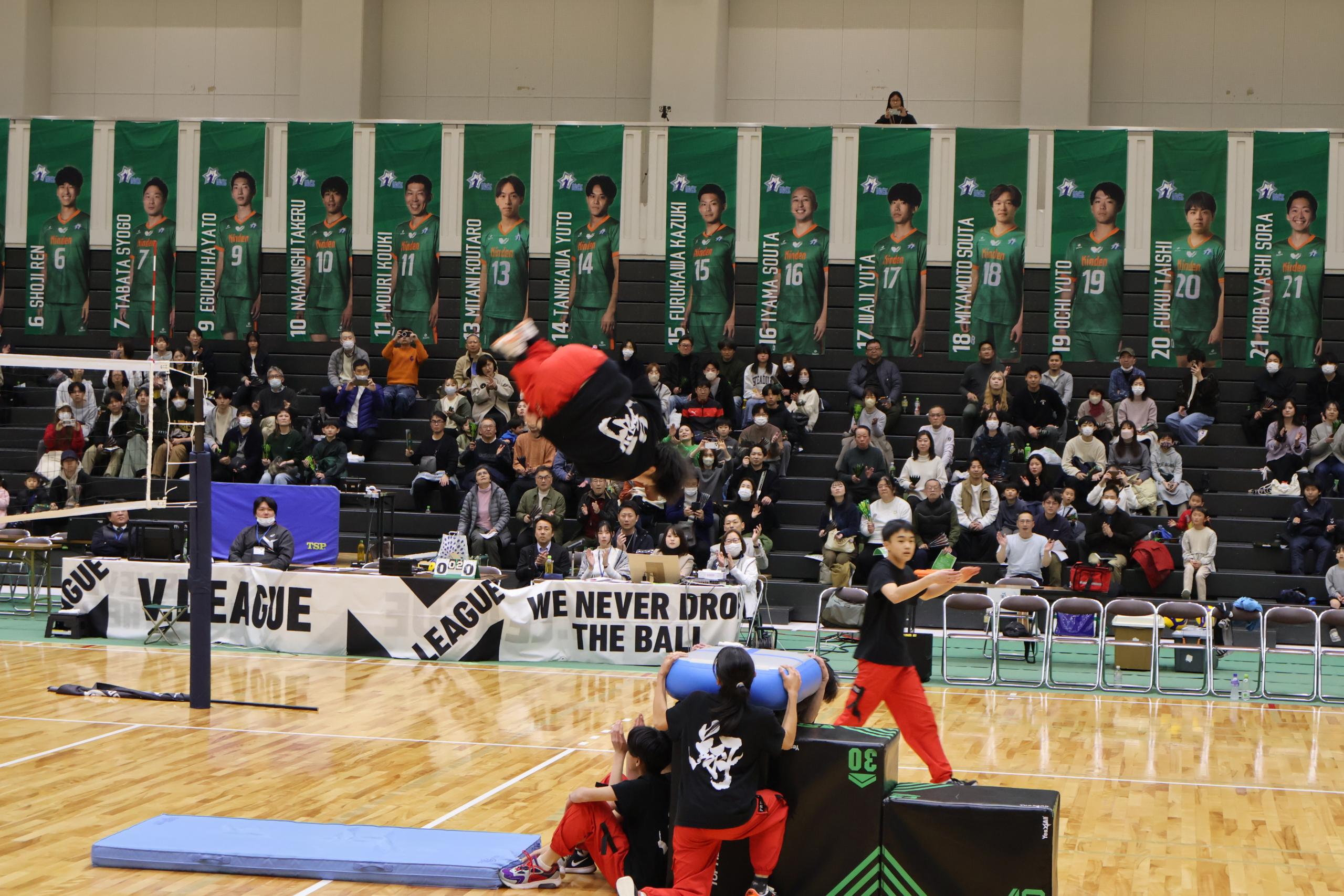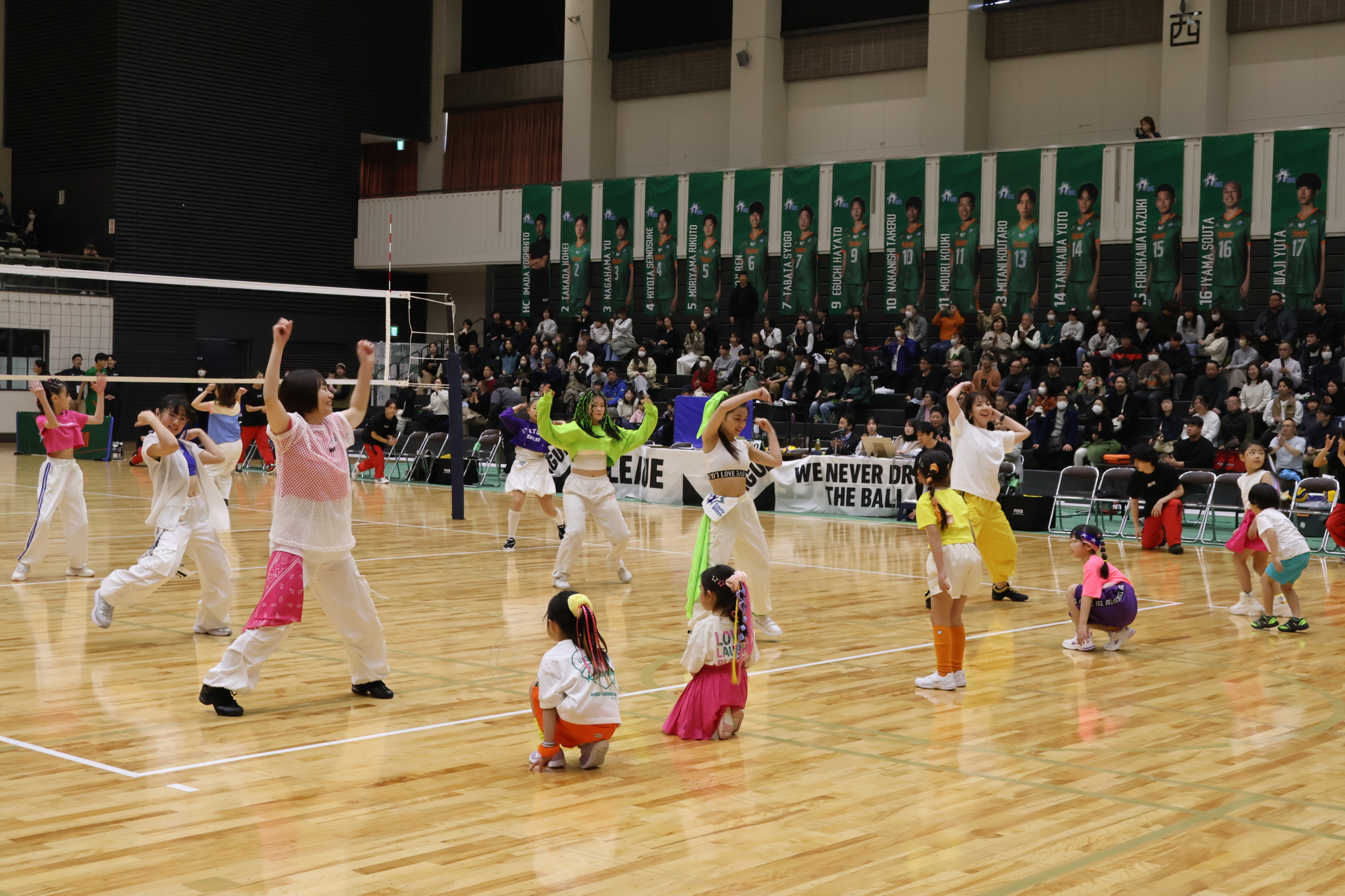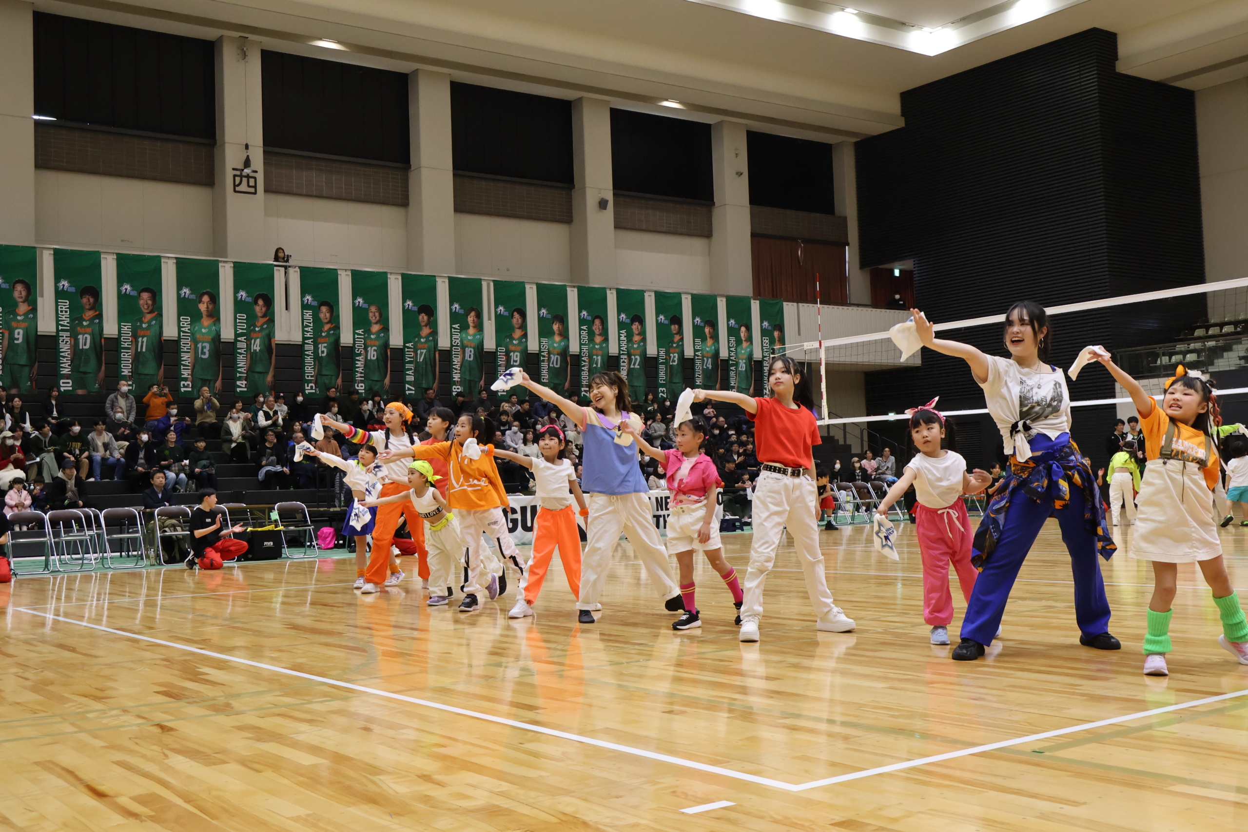 キッズダンスでは、かわいらしく息の合った振り付けを披露していただき、アクロバットパフォーマンスでは、バク転やバク中など迫力満点の技の数々で、会場を大いに沸かせてくださいました。選手を含めた会場全体が一体となって盛り上がる素晴らしい演技でした!